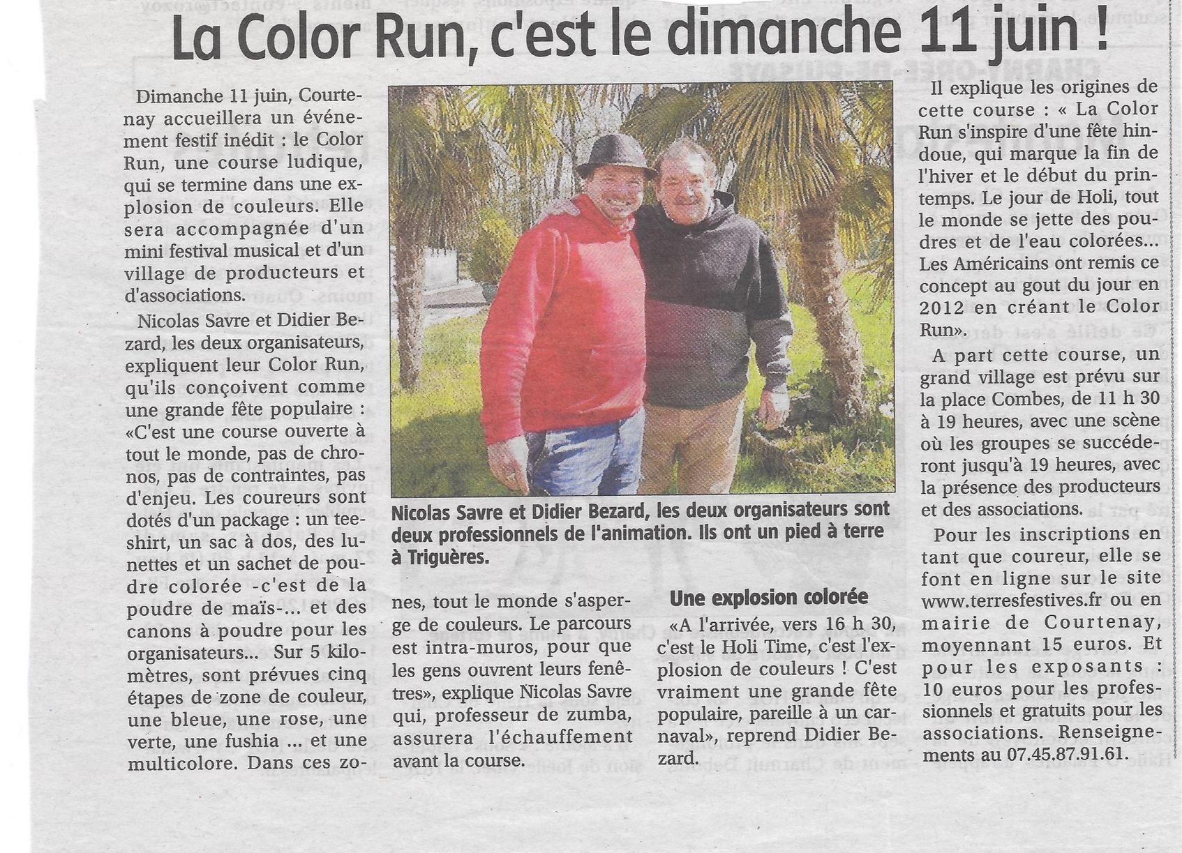 Organisée pour la première fois à Phoenix aux États-Unis en 2012 et désormais courue dans plus de 200 villes à travers le monde, la Color run est la course la plus colorée de la planète. À Dadonville, la course fera environ cinq kilomètres, jalonnée tous les 850 mètres d’une zone de couleur animée par des bénévoles qui lancent de la poudre orange, verte, bleue, rouge… 100 % naturelle et comestible. Les couleurs utilisées ont chacune une signification : le vert représente l’harmonie, l’orange l’optimisme, le bleu la vitalité et le rouge la joie et l’amour.